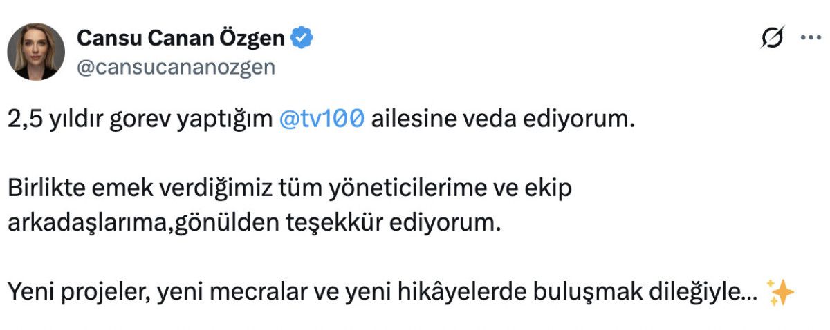 • Cansu Canan Özgen, tv100’den ayrıldığını duyurdu.